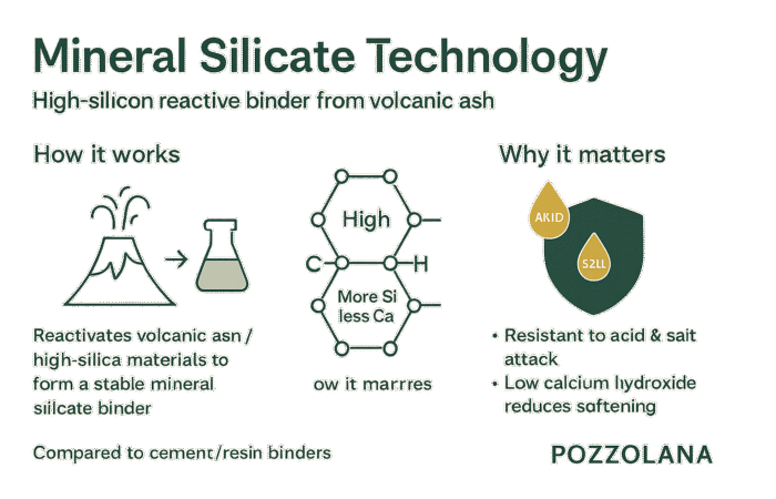 Mineral silicate is a much more environmentally friendly alternative to conventional cement for non-structural use. It is made by simple blending process of volcanic-based natural materials and industrial byproducts to significantly reduce the carbon footprint when compared to cement production, while also being highly resistant to many chemical compounds.