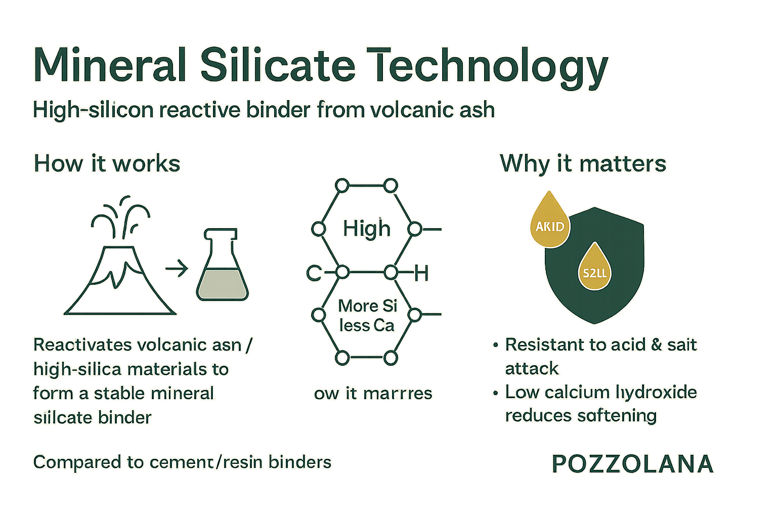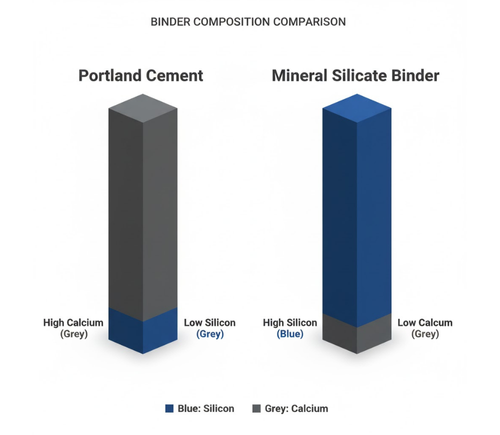 It contains much more silicon and much less calcium than cement. The high content of calcium hydroxide in hydrated cement is highly susceptible to chemical attack, causing cement mortar or concrete to deteriorate. Whereas hydrated mineral silicate binder contains much higher amounts of Calcium Silicate Hydrate (CSH) which is a very stable element.